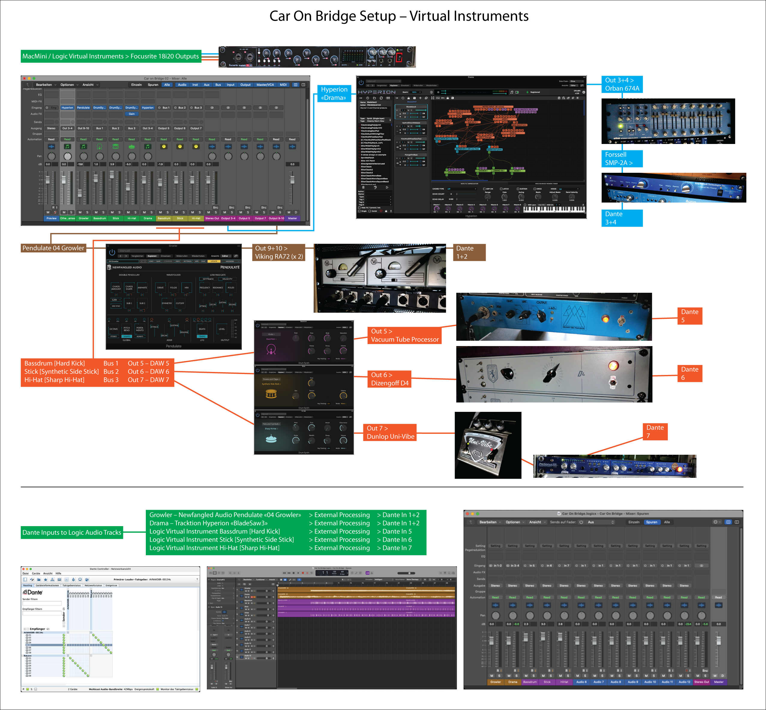 Hard-Kick / Vacuum Tube Processor VTP-1B > Dante So die Worte des Herstellers Christopher Curl. Ein handgemachter Röhrenvorverstärker moderner Bauart nach klassischem Vorbild. Da man hier sehr schnell mit dem Gain die Röhren übersteuern kann, ergab das für das «Hard-Kick» ein starke Verzerrung, ähnlich wie Ringo's Schlagzeug in den frühen Beatles-Aufnahmen. Synthetic Side Stick / Dizengoff Audio D4 > Dante https://dizengoffaudio.com/collections/rack-mount/products/dizengoff-audio-d4-mic-preamp-1 Eine ähnliche Angelegenheit wie beim Vacuum Tube Processor VTP-1B. Der Dizengoff Audio D4 hat die REDD.51 Röhrenkonsole zum Vorbild. Dieses Pult wurde in 1964 bis 1968 von EMI im Abbey Road Studio 2 eingesetzt, um die Beatles and Pink Floyd aufzuzeichnen. Das D4 ist eine in Chicago hergestellte «erweiterte» Fassung des Kanalzugs, da das D4 mehr Einstellmöglichkeiten als das Orignal hat. Der Dizengoff kann sehr klar sein, aber auch gut verzerren – aber nicht heftig verzerren. Der «Synthetic Side Stick» wurde mit dem D4 vor dem Dante angehoben. Sharp Hi-Hat / Dunlop Uni-Vibe / Revive Audio Modified Presonus MP20 > Dante Kaum hörbar auf «Dreams» auf dem Fleetwood Mac «Rumors» Album, lauft das Hi-Hat durch einen Phaser. Machen wir doch auch so. Also ging das «Sharp Hi-Hat» durch einen «Dunlop Uni-Vibe». Das Uni-Vibe ist eigentlich ein Bodeneffektgerät für Elektrogitarre. Der japanische Hersteller Shin-Ei hatte in den Sechzigerjahren versucht, den Lesliesound in eine Effektbox zu quetschen. Nicht ein jeder wollte oder konnte ein Lesiekabinett herumschleifen. Die Firma wurde zu Univox bis dann die Rechte an Dunlop verkauft wurden. Das Dunlop Uni-Vibe hat zwei Einstellungen, grün für Chorus und rot für Vibrato. In diesem Fall wurde grün angewählt. Auch hier gab es relativ wenig Pegel. Deshalb wurde der Dunlop-Klang mit einem Revive Audio Modified Presonus MP20 angehoben. Revive Audio ist eine amerikanische Firma, ca. 20 km von Nashville entfernt, die sich darauf spezialisiert hat, bereits bestehender Audiotechnik einen Upgrade zu verleihen, indem interne Komponenten durch bessere Komponenten ausgewechselt werden und die Unit neu eingemessen wird. So geschehen mit dem Presonus MP20. Basierend auf die angehobene Qualität des MP20 wurde das Hi-Hat verstärkt, bevor es ins Dante ging. |