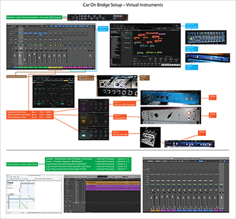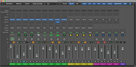 Aus den Schichten eines Soundtracks – Eine Art von Teilchenphysik Da kommt das Blank Slate zu Einsatz. Zunächst ist gar nichts da, und ich denke mir, diesmal fange ich nicht einfach irgendwo im Weltall an und baue mir so etwas wie einen Clicktrack. Und greife zum Drumkit Designer im Logic. Schon deshalb, weil der Klopfgeist (das Logic Metronom) auf Biegen und Brechen nicht zum Dante raus will. Also ertrommle ich mir im Virtual Instrument eine kurze Drum Squence und loope diese MIDI-Spur – was ich alle Schaltjahre einmal mache, ich bin gar kein Freund von Loops. Auf diese Sequenz baut der Soundtrack für das Car On Bridge auf, die synthetischen Teile und auch die ganze Perkussion. Interessanterweise lassen sich hier die «Naturinstrumente» praktisch nicht ein auf ein Zusammenfügen mit den Synthesizern. Einzig und allein der Elektrobaß ließ sich in den «Taiko»-Track integrieren. Es ergaben sich also diverse Spuren, die in sich wieder nur bestimmte andere Teile klanglich zuließen. Sogar der »Klicktrack» bekam seine eigene Nachbearbeitung als eigenständige Spur. Dazu diente das Plugin «MUnision» der Firma Melda Productions. |