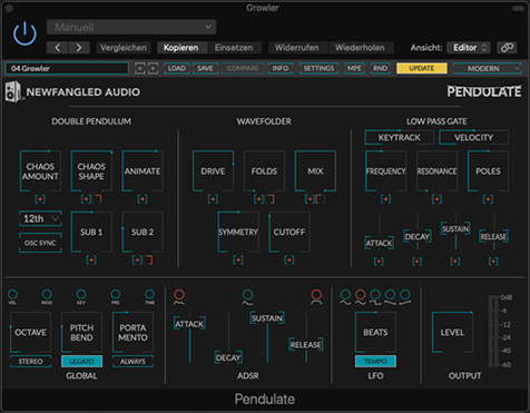Neufangled Audio – Pendulate ![]() Neufangled Audios Pendulate wird derzeit – FREE – von Eventide Audio als «Chaotic Synth» vertrieben. Eventide gibt es ja schon Ewigkeiten lang und hat mit seiner Elektronik die Rock- und Popmusik sehr bereichert. Natürlich auch den Bereich der Minimal-Music, denn der «Ha-Ha-Ha»-Loop in Laurie Anderson's «O Superman» stammt aus einem der ersten Eventide Module, dem Eventide H910. Inzwischen hat Eventide jede Menge Hardware auf dem Markt (auch Gebrauchtmarkt) und hatte irgendwann damit begonnen, Plugins zu entwickeln, nicht nur von der ursprünglichen Hardware, auch nicht Hardware-Orientiertes. Pendulate is a chaotic mono-synth that uses a brand new double-pendulum-oscillator to create previously unheard sounds — biting basses, searing leads, and gritty textures. It can smoothly fade from a sine wave to total chaos, with an expanse of territory to explore in between. Soweit der Beschrieb des Anbieters. Und soweit ist das richtig auffasse, basiert die Klangerzeugung auf den Buchla 259 Complex Waveform Generator. Damit hat es hier einen weiteren Querverweis. Hier taucht der Name eines ganz großen Synthesizer-Bauers auf: Don Buchla, der 2016 verstarb. Eher bekannt ist Bob Moog, dessen kommerzieller Erfolg Buchla in den Hintergrund drängte. Ich würde meinen, sehr zu Unrecht, die Buchla-Module waren gleichermaßen Innovativ, aber vermutlich schwieriger zu handhaben. Auch hier hatte ich mir nicht die Mühe gegeben, in die Tiefe der Programmierung zu tauchen. Ähnlich wie am Hyperion werde ich hoffentlich einen Tag finden, ein «Neue Klänge braucht das Land» in Szene zu setzen. An einem einzelnen Tag kann man dabei ganz wundersame Labyrinthe erkunden. Und die Pfade als Preset abspeichern. In diesem Fall entschied ich mich für einen schnarrenden Baßsound. Apple Logic als Sequencer ![]() ![]() Auf mehreren Spuren wurden die Synthesizer- und Drumspuren gelegt und über die Einzelausgänge eines Focusrite 18i20 ausgegeben, als Stereospuren oder Einzelspuren. Dazu diente das Scarlett Mixcontrol für das Einordnen der Ausgänge. Nachbearbeitung analog, danach über Dante auf einem zweiten Computer 24 Bit / 192 kHz aufgenommen. |