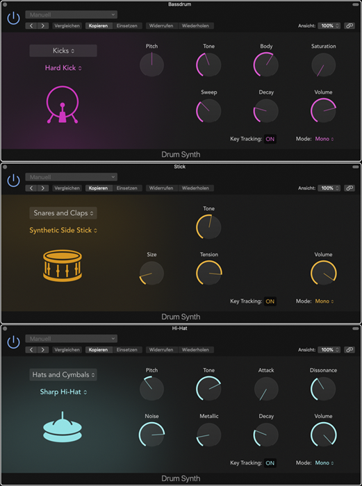 Tracktion – Hyperion ![]() Efficient processing enables up to 16 layers of MPE capable complex sound patches which can be affected in unison by macro controls, but which can also send modulation data and aux buss audio between each other. https://www.tracktion.com/products/hyperion Das ist doch Ein-Mann-Ein-Wort. Hier spalten sich schon die Bereiche «Sound-Designer», «Produzent», «Musiker», «Komponist» – lassen wir hier die Liste auslaufen. Es hat genug Preset-Instrumente, die zum Teil gute Klangbilder vorweisen, diese sogar in Hülle und Fülle. Blicke ich ein bis drei Jahrzehnte zurück, so ist sehr oft festzustellen, daß die Presets der damaligen Synthesizer nicht unbedingt allzu innovativ waren. Erst, wenn man selbst einmal an die Weltraumwurst ging und diese neu Programmierte, da kamen erst die interessanten Klänge hervor. Die Synths hatten jede Menge Potential, das singende und klingende Bäumchen mußte man aber selbst pflanzen. Zugegeben, ich hatte mich nicht lange mit den Klängen des Hyperion durchgesteppt, ich hatte einen bestimmten Klang im Hinterkopf und diesen traf ich sehr schnell an. Dennoch: Der Hyperion ist ein Klangerzeuger, der dazu auffordert, Zeit in ihm zu investieren, das Manual zu studieren und dann systematisch seine Klangwelten zu erforschen. Das wird vermutlich viel Zeit brauchen. Man beachte: Es ist auch möglich, Samples in diversen Formaten einzulesen und diese in der hochkomplexen Matrix zu integrieren. Apple – Virtual Drums So mancher Hardware-Synthesizer bietet jede Menge Drumsounds an. Desgleichen auch die diversen Digital Audio Workstations. Eigentlich suchte ich zunächst nur nach einem Taktgeber. In erster Linie eine Bassdrum mit viel Wucht. «Hard-Kick» aus der Logic-Trommelmaschine klang ganz gut. Vielleicht wäre es angebracht gewesen, einen Baßdrumsound aus dem Roland SPD-8 Total Percussion Pad aus dem Jahre 1991 anzusteuern, aber das war mir doch zuviel Hardware und Neuverkabelung, irgendwo muß man sich ja doch zurücklehnen ... aber nicht aufgeschoben, denn das erinnert mich daran, daß da ein paar wuchtige Sounds lagern. Was nach vielen Jahren neu zu erkunden ist. Irgendwie zwickt's mich, den Drummulator verkauft zu haben. Dabei hatte ich mir sogar persönlich im Laden beim Sam Ash in New York ein MIDI-Retrofit Kit besorgt. Der Drummulator von E-MU hatte knackige und wuchtige Klänge in seinen Chips. Aber irgendwie hatte ich keine Verwendung mehr für Drum-Machines und entließ sie wieder in die freie Wildbahn. Eigentlich sollte man alles behalten, was man hat. Das Lebensende wird ja eh alles wegnehmen. Bis dahin sollte man sein Spielzeugparadies zu schätzen wissen. Das zweite Instrument aus dem Drumset war der «Synthetic Side Stick». Es scheint eine Kunst zu sein, einen schönen, hölzernen Sidestick-Sound zu kreieren. Etliche Jazz- und Motown Platten können davon zeugen. Der Klang hier kam in die Röhrensättigung. Und ein «Sharp Hi-Hat» aus der gleichen Schmiede. Etwas unscheinbar Interessantes gefällig? Siehe weiter unten ... digitales Hi-Hat über Dunlop Univibe. Es stehen einem jeden, damit auch mir, die Erlaubnis zur Verfügung, Änderungen zu machen. So klar ich die Strukturen aufzeichne, plopp, plopp ergeben sich die Modifikationen. Die Matrix verändert sich und die Signalwege müssen sich anpassen. So wurde der Presonus Preamp dann mit dem Grace Design ersetzt. Aber am Basic Setup war es doch nicht viel. Es ist halt unmöglich einen Arbeitsfluß wirklich festzuhalten. Flüsse kann man nicht wirklich bändigen. |