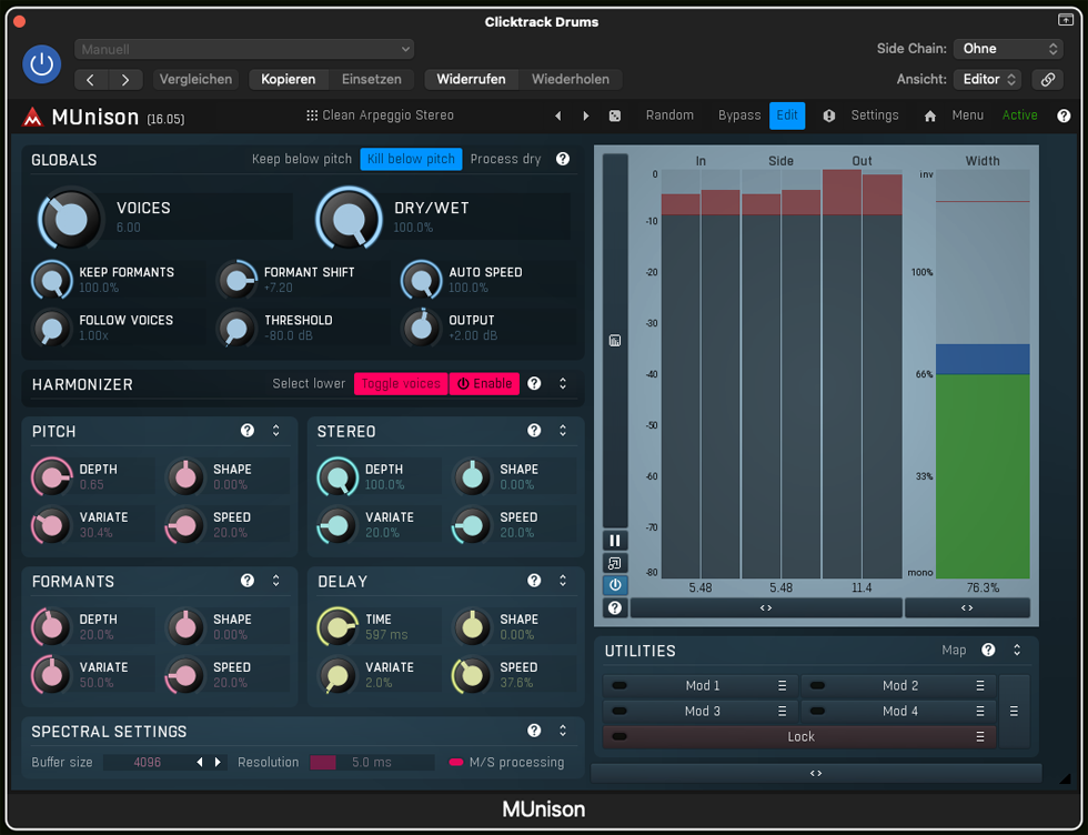 Aus den Schichten eines Soundtracks – Eine Art von Teilchenphysik Da kommt das Blank Slate zu Einsatz. Zunächst ist gar nichts da, und ich denke mir, diesmal fange ich nicht einfach irgendwo im Weltall an und baue mir so etwas wie einen Clicktrack. Und greife zum Drumkit Designer im Logic. Schon deshalb, weil der Klopfgeist (das Logic Metronom) auf Biegen und Brechen nicht zum Dante raus will. Also ertrommle ich mir im Virtual Instrument eine kurze Drum Squence und loope diese MIDI-Spur – was ich alle Schaltjahre einmal mache, ich bin gar kein Freund von Loops. Auf diese Sequenz baut der Soundtrack für das Car On Bridge auf, die synthetischen Teile und auch die ganze Perkussion. Interessanterweise lassen sich hier die «Naturinstrumente» praktisch nicht ein auf ein Zusammenfügen mit den Synthesizern. Einzig und allein der Elektrobaß ließ sich in den «Taiko»-Track integrieren. Es ergaben sich also diverse Spuren, die in sich wieder nur bestimmte andere Teile klanglich zuließen. Sogar der »Klicktrack» bekam seine eigene Nachbearbeitung als eigenständige Spur. Dazu diente das Plugin «MUnision» der Firma Melda Productions. |